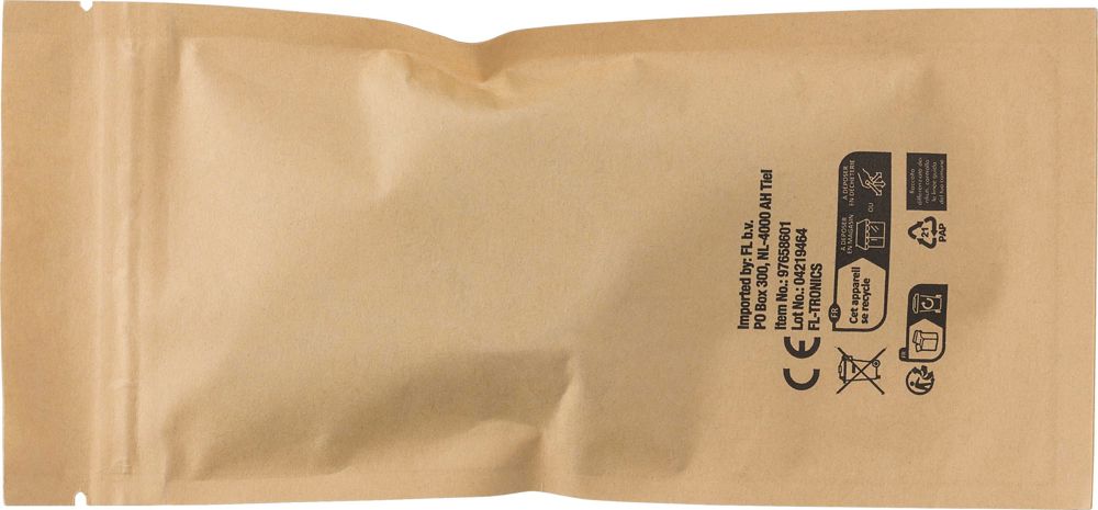 Verlängerbares ABS-Ladekabel mit Details aus Bambus. Mit USB-C, Lightning und USB-A. Einzeln verpackt in einem braunen Kartonbeutel.
