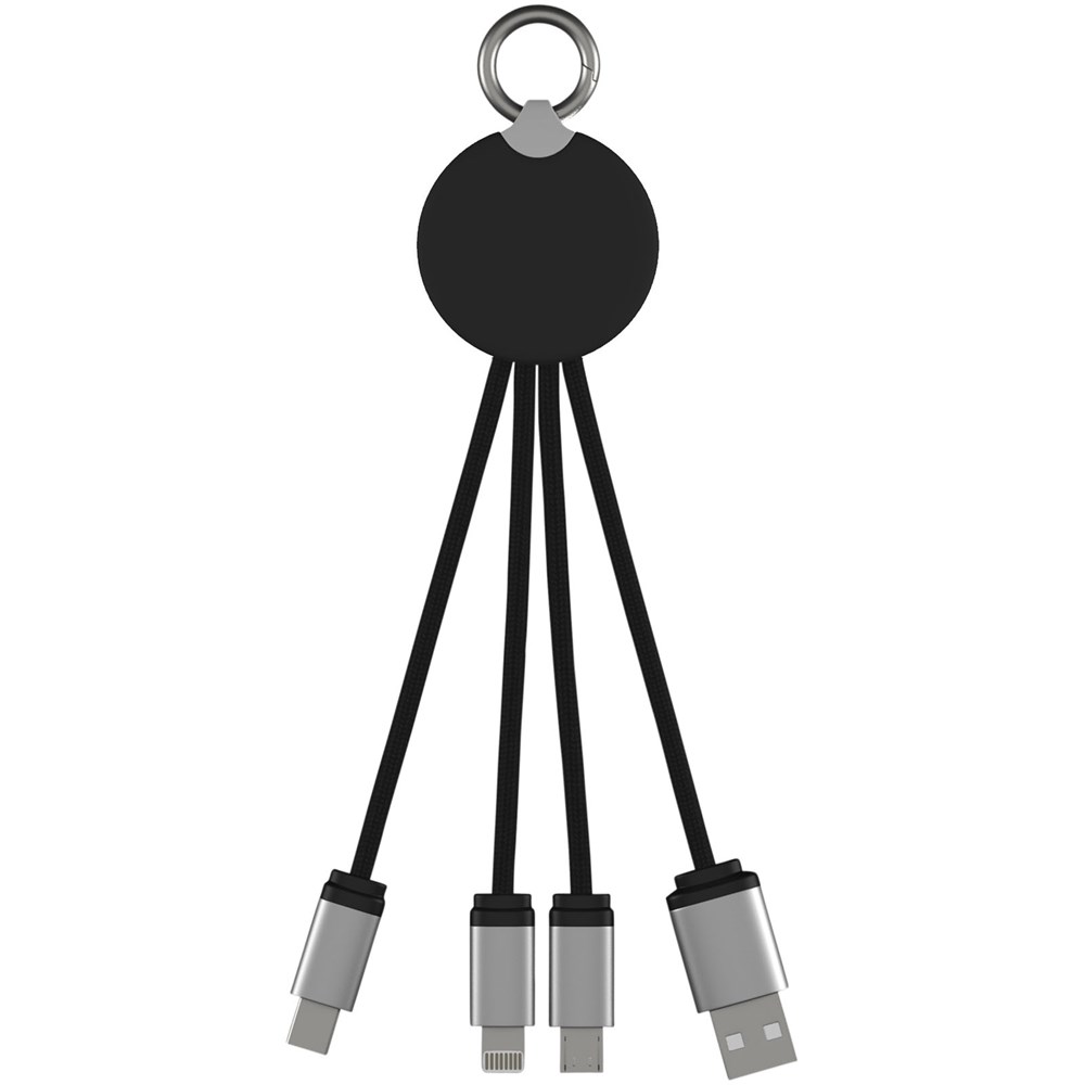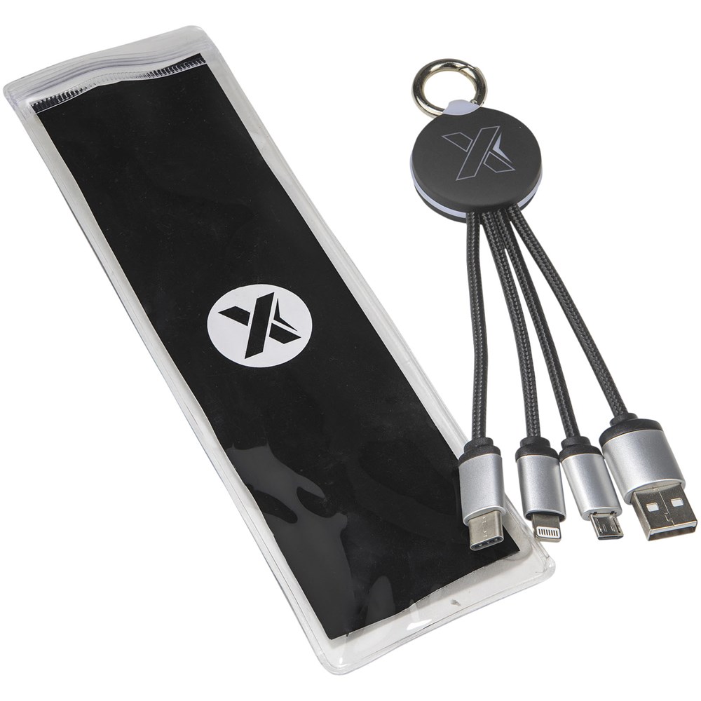 Beleuchtetes Logo-Ladekabel mit Gummi- und Metalloberfläche, ausgestattet mit drei Steckern (Typ-C, Android, iPhone). Es können bis zu drei Geräte gleichzeitig aufgeladen werden. Länge der Kabel (einschließlich Stecker): 10 cm. Kabel aus recyceltem PET-Kunststoff und die Verpackung besteht aus recyceltem Papier und recyceltem Kunststoff.